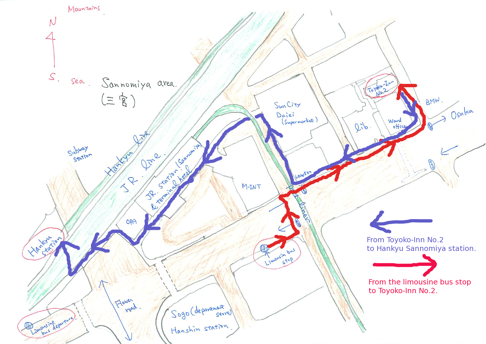 [Toyoko-Inn Sannomiya No.2->Hankyu Sannomiya station ].