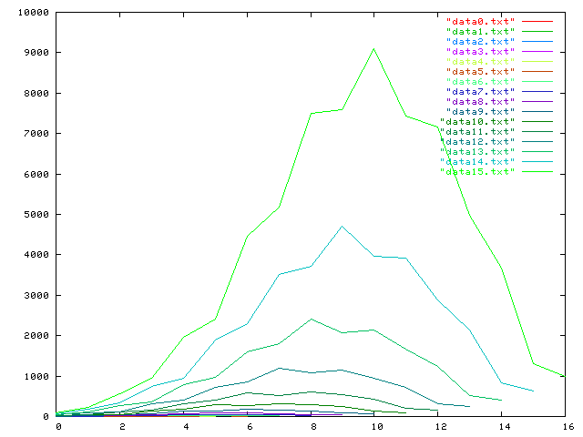 p=0.8 の例 低い ← レベル → 高い ↓時間 1 1 1 1 2 1 0 3 4 1 1 1 6 7 1 0 4 6 10 10 2 3 2 10 15 16 15 3 1 9 11 21 29 28 24 5 2 8 21 33 47 49 49 40 7 2 9 28 57 76 91 91 85 63 10 2 14 37 79 130 156 177 167 142 103 17 6 13 49 115 202 271 308 351 302 231 171 29 15 25 72 170 304 440 575 629 637 511 375 295 48 18 50 107 222 450 738 950 1177 1217 1147 924 636 484 72 28 67 168 337 629 1101 1702 2026 2337 2328 2063 1644 1051 789 114 45 110 225 520 991 1680 2600 3682 4127 4536 4382 3762 2937 1703 1287 181 72 155 383 732 1530 2707 4066 5732 7708 8389 8811 8180 6732 5212 2777 2060 290 108 243 540 1235 2209 4091 6643 9544 12533 15885 16709 16708 15164 12010 9173 4520 3291 466 148 393 863 1742 3596 6129 10361 15785 21864 26622 31879 32715 31424 28101 21101 15918 7472 5292 739